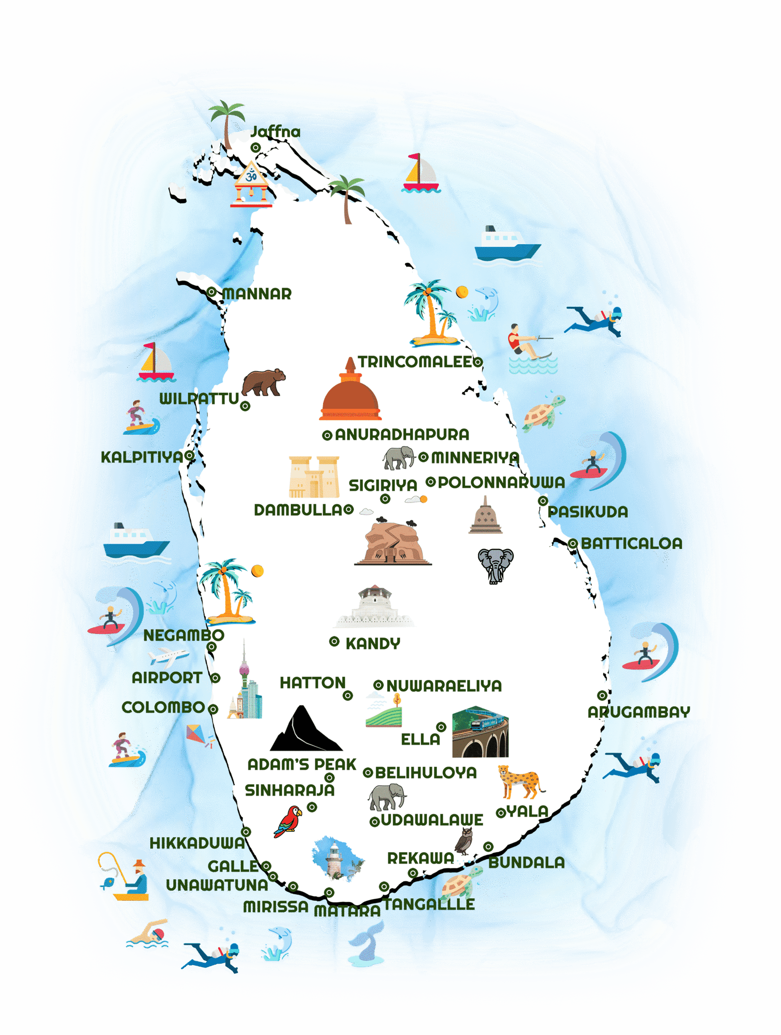Discover Sri Lanka’s top destinations and experiences in one colorful map — from ancient wonders to coastal adventures.